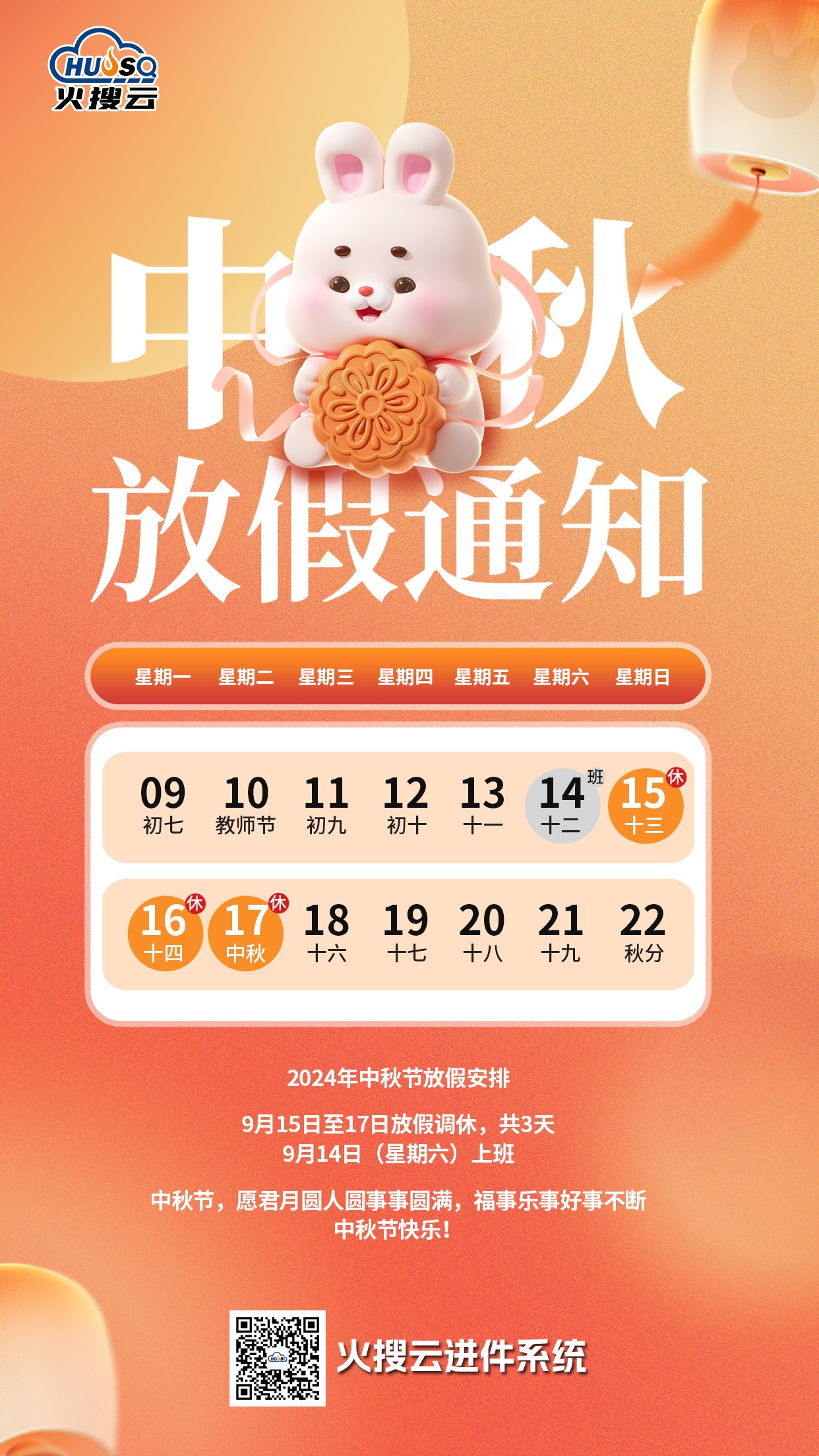 新聞資訊 縱觀全局,深度聚焦,關注汽車金融新趨勢 2024年中秋節放假通知 2024-9-15 2:39:19 次瀏覽 各位員工:  根據國家節假日安排,2024年中秋節放假時間為9月15日(周日)至9月17日(周二),共三天。9月14日(周六)正常上班。 請大家提前安排好工作,確保假期期間公司業務的正常運轉。 祝大家中秋節快樂,闔家幸福! 各位員工: 根據國家節假日安排,2024年中秋節放假時間為9月15日(周日)至9月17日(周二),共三天。9月14日(周六)正常上班。 請大家提前安排好工作,確保假期期間公司業務的正常運轉。 祝大家中秋節快樂,闔家幸福! 上一篇:2024年國慶節放假通知 下一篇:2024年五一放假通知